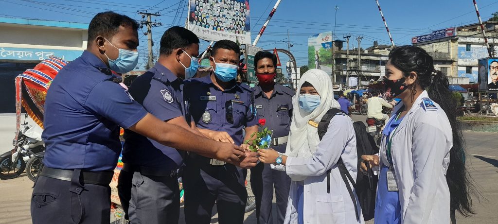 আজ রোববার সকালে এমন দৃশ্য চোখে পড়েছে সৈয়দপুর শহরের পাঁচমাথা মোড়ে স্কুল-কলেজগামী শিক্ষার্থীদের মাঝে। ট্রাফিক বিভাগের সদস্যরা ফুলের সাথে হ্যান্ড স্যানিজেটর ও সার্জিকাল মাস্ক বিতরণ করেছে।