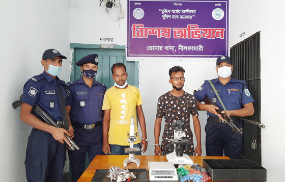 থানা সুত্রে জানা, ডোমার পুলিশ সার্কেল কার্যালয়ের সিসি ক্যামেরা ফুটেজে ডোমার বহুমূখী উচ্চবিদ্যালয়ের চুরির দৃশ্য দেখা যায়। মঙ্গলবার সকাল ১১ টার সময় (ডোমার-ডিমলা) সার্কেলের সহকারী পুলিশ সুপার আলী মোহাম্মদ আব্দুল্লাহ ও ডোমার থানা ওসি সাইফুল ইসলামের নেতৃত্বে এএসআই ফারুক হোসেনসহ ডোমার থানার পুলিশ মুন্নার ভাড়া নেওয়া বাড়ি ও বিদ্যালয়ের সামনে তার বন্ধ চায়ের দোকান হতে ২টি অনুবিক্ষণ যন্ত্র, ১টি কীটবক্স, ১টি ওজন পরিমাপক যন্ত্র, ১০টি ক্লাম উদ্ধার করা হয়েছে। এ সময় মুন্নাকে গ্রেফতার করা হয়। মুন্নার দেওয়া তথ্যের ভিত্তিতে বিভিন্ন স্থানে অভিযান পরিচালনা করা হয়। বিকালে বনোয়ারী মোড় হতে নওশাদকে গ্রেফতার করা হয়েছে।