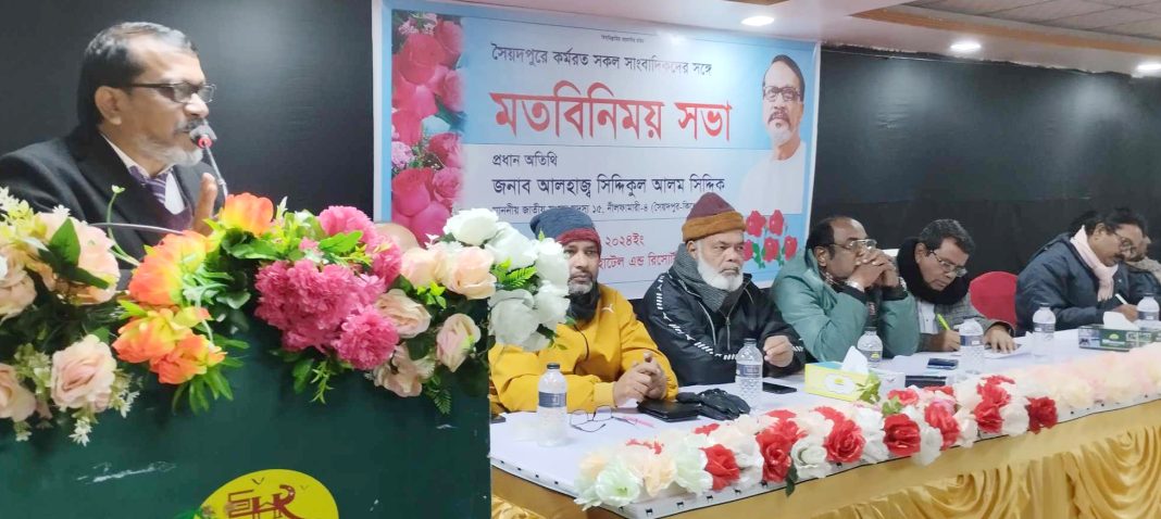 প্রধান অতিথি সাংসদ জনাব আলহাজ্ব সিদ্দিকুল আলম সিদ্দিক স্বাগত বক্তব্য বলেন, আমি আগামীর পথচলায় দিক নির্দেশনা ও পরামর্শের জন্যই সংবাদ কর্মীদের আহ্বান জানিয়েছি। সকলের সম্মিলিত প্রচেষ্টায় সৈয়দপুর ও কিশোরগঞ্জে বৈষম্যহীন সমান্তরাল উন্নয়ন করতে চাই। এক্ষেত্রে জনগুরুত্বপূর্ণ বিবেচনায় বেশি প্রয়োজনীয় কাজকে প্রাধান্য দিতে চাই। সেই সাথে সৈয়দপুর বিমানবন্দরের উন্নয়ন করে আন্তর্জাতিক মানের উত্তরণসহ অধিগ্রহণকৃত জমির ক্ষতিপূরণের অর্থ দ্রুত প্রদানের ব্যবস্থা করা, রেলওয়ে হাসপাতাল কেন্দ্রীক মেডিকেল কলেজ দ্রুত বাস্তবায়ন, শিক্ষানগরী সৈয়দপুরে বিশেষায়িত বিশ্ববিদ্যালয় প্রতিষ্ঠা করা, শ্রমিক অধ্যুষিত এই শহরের পেশাগত মান উন্নয়নের জন্য আন্তর্জাতিক মানের প্রশিক্ষণ কেন্দ্র স্থাপন ও শহরের যানজট নিরসনে কার্যকর উদ্যোগ সহ কোচ স্ট্যান্ড করার ক্ষেত্রে সর্ব প্রথম উদ্যোগ নেয়ার আশ্বাস দেন। এজন্য সকলকে নিয়ে একটি কমিটি করে উপযুক্ত জায়গা নির্ধারণের কথা জানান। সৈয়দপুর ১০০ শয্যা হাসপাতালকে পরিচ্ছন্ন ও সেবার মান উন্নয়ন সহ সর্বোচ্চ গুরুত্ব দেওয়া হবে সৈয়দপুর পৌর এলাকার রাস্তার উন্নয়নে। একই সাথে অন্যান্য বিষয়গুলোও গুরুত্বের সঙ্গে সমাধানে ব্যবস্থা নেয়ার ব্যাপারে আন্তরিক প্রচেষ্টা থাকবে বলে জানান।