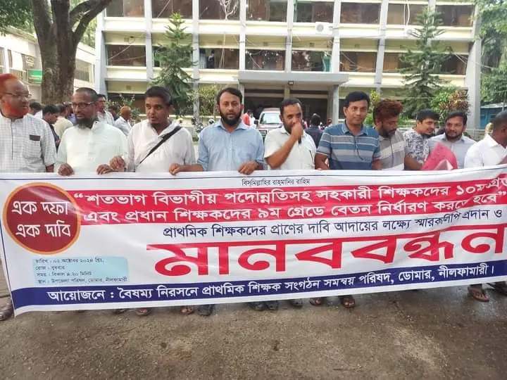 আনিফ রহমান (ডোমার) : শতভাগ পদোন্নতি সহ সরকারি প্রাথমিক বিদ্যালয়ের সহকারী শিক্ষকদের ১০ম গ্রেড ও প্রধান শিক্ষকদের ৯ম গ্রেড বাস্তবায়নের দাবিতে নীলফামারীর ডোমারে মানববন্ধন ও স্মারকলিপি প্রদান কর্মসূচি পালন করেছেন প্রাথমিক বিদ্যালয়ের শিক্ষকরা।