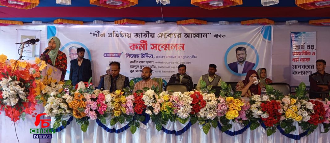 চিকলী নিউজ : নীলফামারীর সৈয়দপুরে জিআরপি কমিউনিটি সেন্টারে হেযবুত তাওহীদের উদ্যোগে দীন প্রতিষ্ঠায় জাতীয় ঐক্যের আহ্বান শীর্ষক এক দিনব্যাপী কর্মী সম্মেলন অনুষ্ঠিত হয়েছে। গত শনিবার (১০ জানুয়ারি)।সম্মেলনটি শুরু হয় দুপুর ১২টা থেকে বিকেল ৫টা পর্যন্ত চলে।এতে আশপাশের হেযবুত তাওহীদের নেতাকর্মীরা ও অংশগ্রহণ করেন।সম্মেলনে প্রধান অতিথি হিসেবে বক্তব্য রাখেন হেযবুত তাওহীদের সাধারণ সম্পাদক নিজাম উদ্দিন। মুখ্য আলোচক ছিলেন কেন্দ্রীয় কমিটির কার্যনির্বাহী সদস্য রাকীব আল হাসান। বিশেষ অতিথি হিসেবে উপস্থিত ছিলেন রংপুর বিভাগীয় সভাপতি আব্দুল কুদ্দুস শামীম। অনুষ্ঠানের সভাপতিত্ব করেন নীলফামারী জেলা সভাপতি নুর আলম সরকার। সৈয়দপুর উপজেলা সভাপতি ওয়াসিম আলমসহ জেলা ও উপজেলা পর্যায়ের হেযবুত তাওহীদের নেতা কর্মীও এতে উপস্থিত ছিলেন।সম্মেলনের শুরু হয় পবিত্র কোরআন তেলাওয়াতের মাধ্যমে। এরপর সভাপতির সংক্ষিপ্ত বক্তব্যে তিনি বলেন, বর্তমান সমাজে অস্থিরতা সামাজিক অবক্ষয় এবং যুদ্ধ ও রক্তপাতের কারণ হলো নৈতিক ও ধর্মীয় মূল্যবোধ থেকে বিচ্যুতি। তিনি বলেন, দীন প্রতিষ্ঠার সংগ্রামে কর্মীদের মধ্যে শৃঙ্খলা নেতৃত্বের প্রতি আনুগত্য এবং একে অপরের সঙ্গে ঐক্যবদ্ধ থাকার গুরুত্ব অপরিসীম।প্রধান অতিথ নিজাম উদ্দিন তার বক্তব্যে বলেন, মানুষের জীবন থেকে অন্যায়, অবিচার, শোষণ ও সহিংসতা দূর করতে হলে আল্লাহর প্রদত্ত আদর্শ ও কর্মসূচি অনুসরণ করা আবশ্যক। তিনি বলেন, ইসলামের মৌলিক আদর্শ বাস্তবায়নের মাধ্যমে সমাজে স্থায়ী শান্তি ও ন্যায়বিচার প্রতিষ্ঠা সম্ভব।